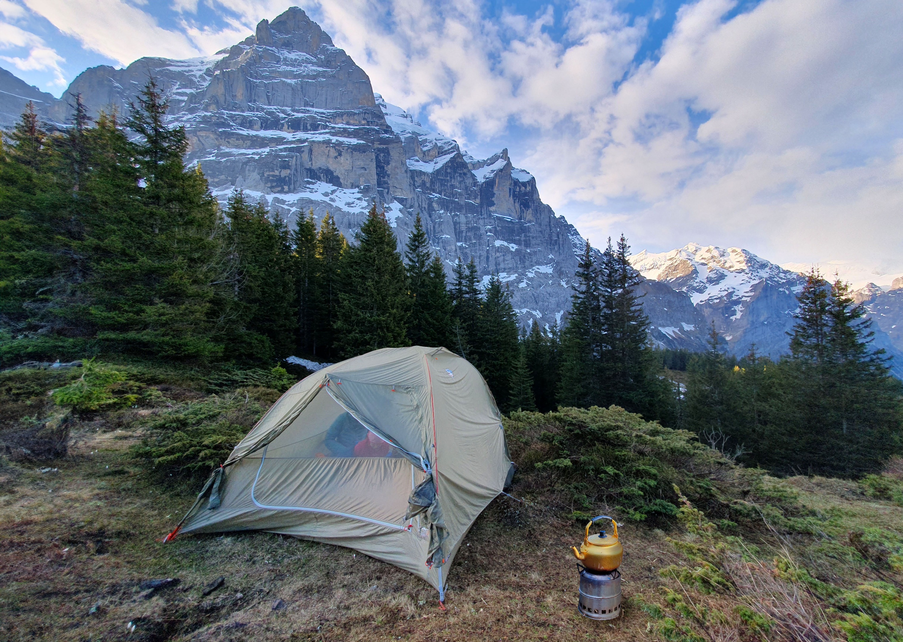 Gegen Abend erreichen wir unseren Übernachtungsplatz. Zwischen Schneefeldern schlagen wir unser Zelt auf. Wir geniessen die wärmende Abendsonne und kochen auf unserem Hobo-Kocher das Abendessen. Eingebettet in dieser eindrücklichen Berglandschaft geniessen wir die Abendstunden. Auf der gegenüberliegenden Talseite brechen immer wieder grosse Schnee- und Eisstücke aus der Nordwand und donnern in grossen Schneelawinen talwärts. Wir bestaunen das Spektakel. Als uns die ersten dicken Regenwolken erreichen, kriechen wir ins Zelt. Am kommenden Morgen wecken uns die ersten Sonnenstrahlen. Nach einem stärkenden Frühstück brechen wir um 8 Uhr auf und wandern 3 Stunden zur nächsten Postautohaltestelle. Unser erstes Kanton-Zelt-Abenteuer ist geglückt